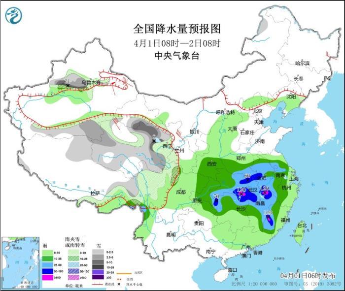 4月1日08時至2日08時,新疆沿天山地區(qū)和南疆盆地、西藏北部和東部、青海大部、川西高原北部等地部分地區(qū)有小到中雪或雨夾雪,其中,新疆沿天山地區(qū)和南疆盆地、青海東北部等地部分地區(qū)有大到暴雪,新疆沿天山地區(qū)局地大暴雪(20~21毫米)。陜西東南部、河南中南部、安徽大部、江蘇中西部、四川東部、重慶大部、貴州東北部、湖北、湖南中北部、江西大部、浙江中西部、福建中西部等地部分地區(qū)有中到大雨,其中,河南南部、安徽中南部、湖北東部和南部、湖南北部和西部、江西北部和東南部、福建西部、重慶東南部等地部分地區(qū)有暴雨,局地大暴雨(100~120毫米)。內(nèi)蒙古西北部、新疆東部、青海西部、甘肅河西等地部分地區(qū)有4~6級風(fēng),其中,新疆東部部分地區(qū)有7~8級風(fēng),山口風(fēng)力可達(dá)11級以上。