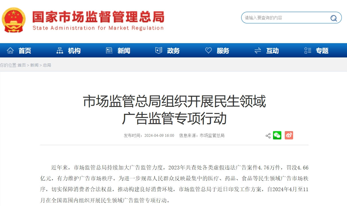 央廣網(wǎng)北京4月9日消息(記者 果君)國(guó)家市場(chǎng)監(jiān)督管理總局于近日印發(fā)工作方案,自2024年4月至11月在全國(guó)范圍內(nèi)組織開展民生領(lǐng)域廣告監(jiān)管專項(xiàng)行動(dòng)。