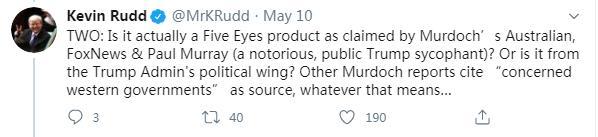 5月8日,陸克文更是在英國《衛(wèi)報(bào)》發(fā)表評論,揭批默多克旗下媒體的謊言,稱其擬將焦點(diǎn)轉(zhuǎn)向中國,為特朗普政府抗疫不力、造成眾多人員傷亡找借口,以助力特朗普連任。