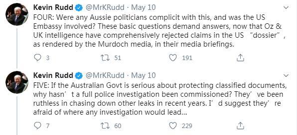 第二問直指“情報(bào)源頭”。陸克文表示,默多克旗下的媒體稱,這份“情報(bào)”來自西方“五眼聯(lián)盟”,真實(shí)情況究竟怎樣?這份“情報(bào)”是否出于特朗普黨派之手?