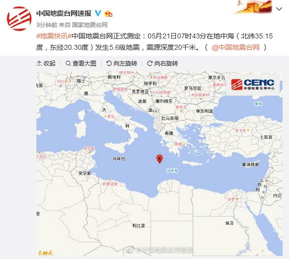 中新網(wǎng)5月21日電 據(jù)中國地震臺網(wǎng)正式測定:5月21日7時43分在地中海(北緯35.15度,東經(jīng)20.30度)發(fā)生5.6級地震,震源深度20千米。