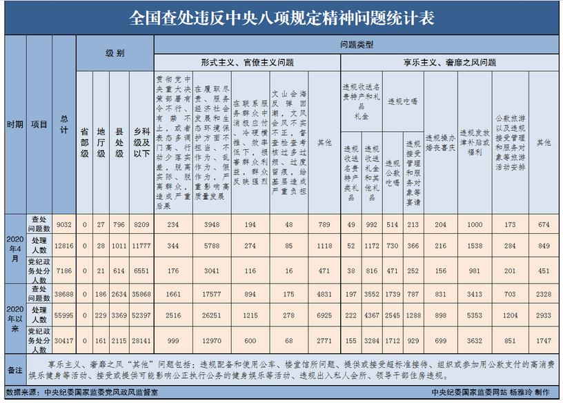 據(jù)介紹,為掌握全國貫徹落實中央八項規(guī)定精神情況,中央紀(jì)委國家監(jiān)委在各省區(qū)市和新疆生產(chǎn)建設(shè)兵團、各中央和國家機關(guān)、各中央企業(yè)和中央金融企業(yè)等建立了落實中央八項規(guī)定精神情況月報制度。2020年以來,截至4月30日,全國查處違反中央八項規(guī)定精神問題情況如下:
