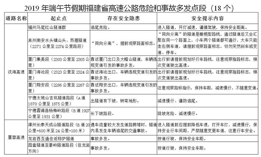 端午節(jié)假期福建各地高速公路危險和事故多發(fā)點段18個、易擁堵路段13個,管制路段1個,如下——