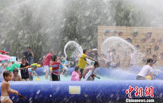 圖為小朋友們在“水槍大戰(zhàn)”現(xiàn)場“激戰(zhàn)”?!$娦?攝