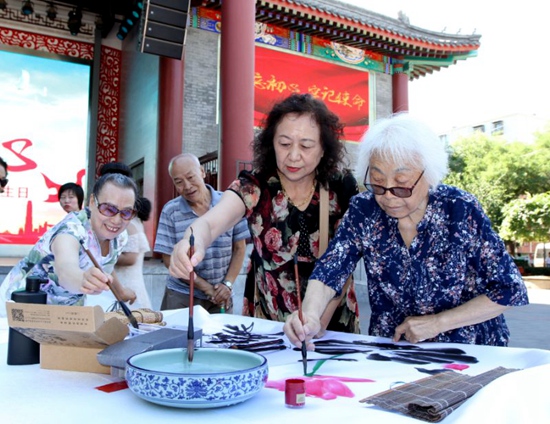 人民網(wǎng)北京6月30日電 6月30日上午,石景山區(qū)八角街道舉辦“百米畫(huà)卷繪初心”——老街坊手繪畫(huà)卷獻(xiàn)禮黨的生日活動(dòng),百余名老街坊揮毫潑墨祝福黨的生日,生動(dòng)地描繪出對(duì)黨對(duì)祖國(guó)的深情厚意。