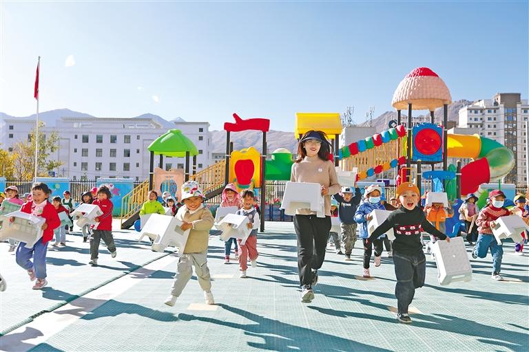 拉薩市江蘇實驗幼兒園的孩子們與江蘇援藏老師在一起做游戲。