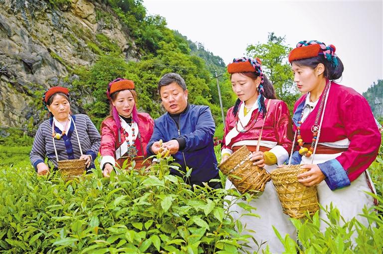 錯那市勒布溝,安徽第七批援藏隊隊員裴含龍指導門巴族村民規(guī)范采摘茶葉。
