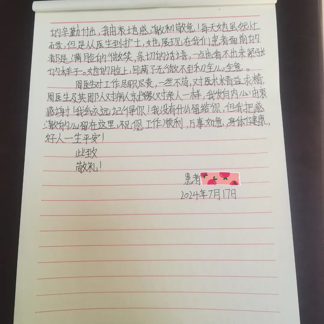 7月1日,一名在德格縣人民醫(yī)院就診的結(jié)核患者向成都市公共衛(wèi)生臨床醫(yī)療中心援藏醫(yī)師周瑜送來了一封感謝信,在信中,患者對周瑜醫(yī)生及其團隊在住院期間給予她的積極診治和熱情關(guān)懷表示感謝,并對科室團隊的診療技術(shù)和治療的預后效果都作出了非常高的評價。