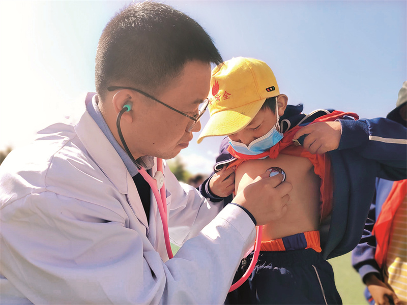2022年4月,南京醫(yī)科大學第二附屬醫(yī)院“心佑”工程團隊的醫(yī)生在西藏自治區(qū)拉薩市曲水縣小學為學生做先天性心臟病篩查。拉姆 攝