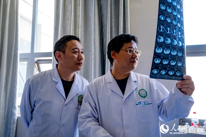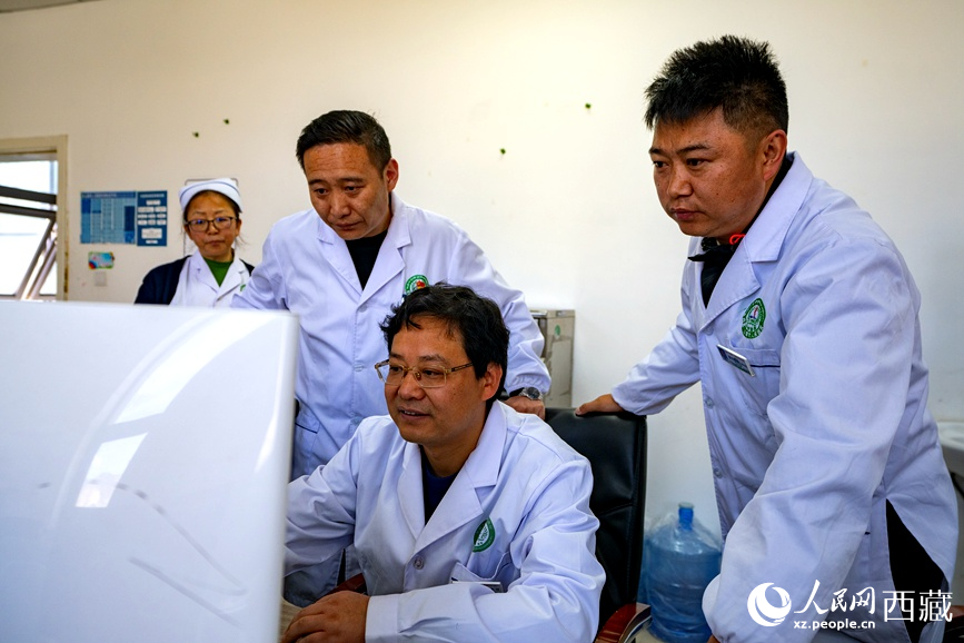 吳維(右一)和強(qiáng)巴旦增(右二)在查看患者的影像資料。人民日報(bào)記者 徐馭堯攝