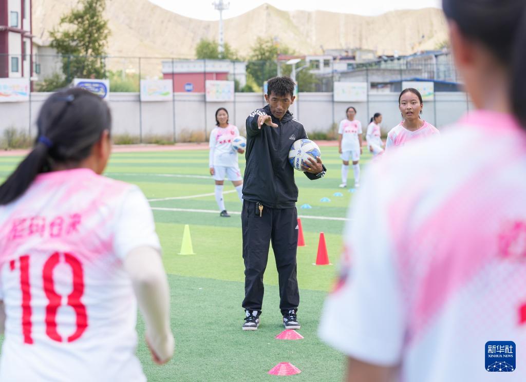 西藏日喀則市上海實驗學校“珠峰雪鷹”女子足球隊教練洛布桑在操場上指導球員訓練(9月3日攝)。