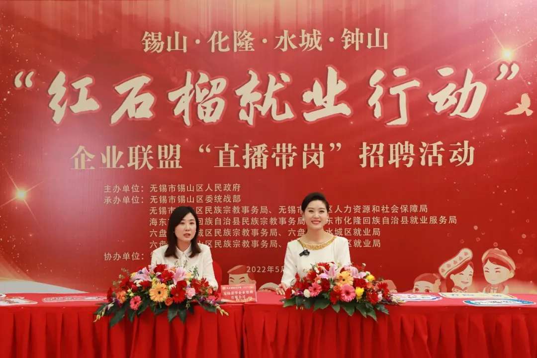 江蘇省無(wú)錫市錫山區(qū)與貴州省六盤水市水城區(qū)、鐘山區(qū),青海省海東市化隆回族自治縣通過(guò)網(wǎng)絡(luò)平臺(tái)舉行“紅石榴就業(yè)行動(dòng)”合作簽約暨企業(yè)聯(lián)盟“直播帶崗”招聘活動(dòng)。江蘇省民族宗教事務(wù)委員會(huì)供圖