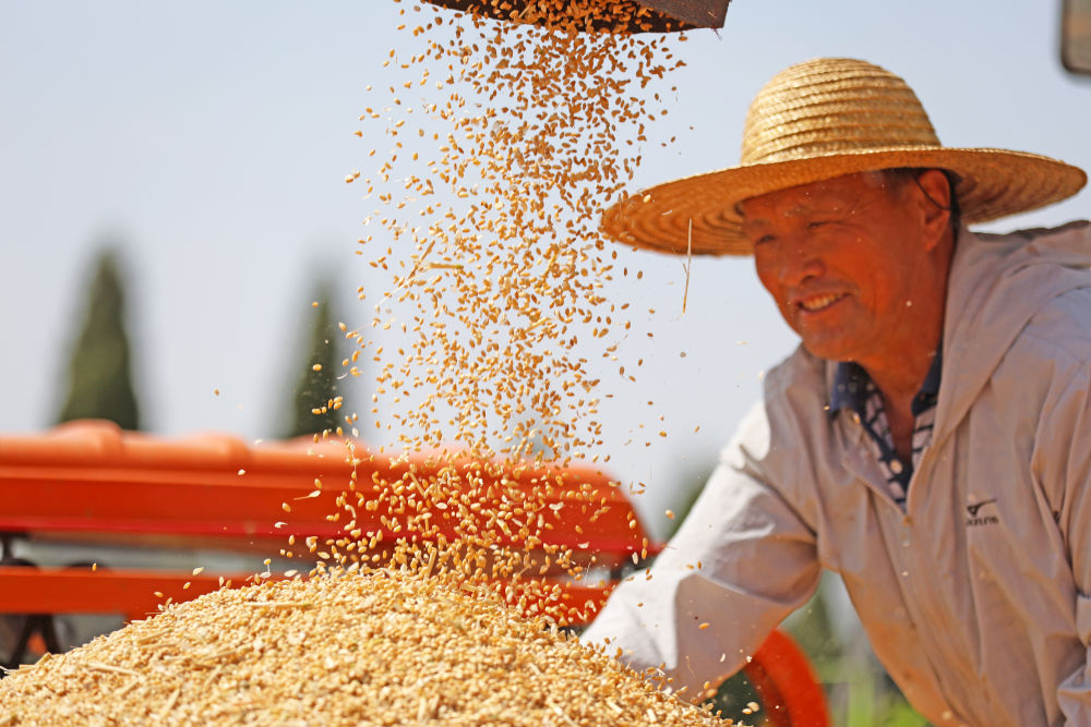 5月25日,山東省臨沂市郯城縣郯城街道山南頭村村民將收獲的小麥裝車。新華社發(fā)(張春雷 攝)