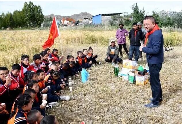上海援藏教師潘杰(右一)帶領(lǐng)學(xué)生在青稞地里上思政課(2021年9月14日攝)。新華社發(fā)
