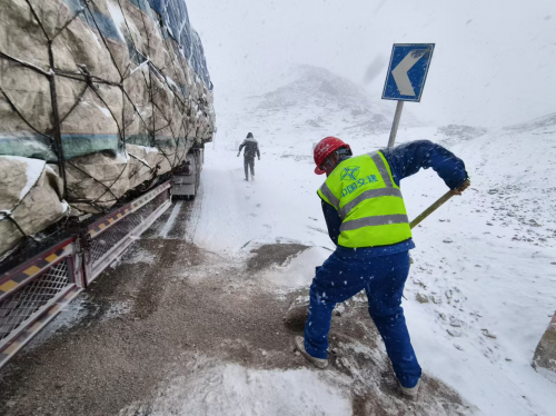事發(fā)時,強降雪導(dǎo)致路面濕滑,卡車在行駛過程中出現(xiàn)打滑,甚至有滑坡的風(fēng)險。駕駛員在緊急制動過程中,車輛失控,險象環(huán)生。在這危急關(guān)頭,途經(jīng)此地的中交建設(shè)者們毫不猶豫地伸出援手。他們冒著嚴(yán)寒,鋪設(shè)碎石、沙子增加道路摩擦力。經(jīng)過一番艱苦努力,物資車輛終于緩緩駛離險境。