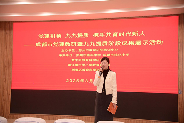 陽春三月,齊聚彭州共教研。為全面貫徹落實黨的二十屆三中全會和全國教育大會精神,系統(tǒng)推進黨的教育方針和黨中央決策部署在中小學得到貫徹落實,堅持“為黨育人、為國育才”。3月25日下午,彭州市隆豐中學開展成都市黨建教研暨“九九提質”階段成果展示活動。