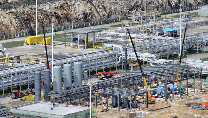 這是2024年6月21日拍攝的位于珠海經濟開發(fā)區(qū)的中海石油深海開發(fā)有限公司二氧化碳回收利用項目塔器安裝現場。新華社發(fā)(邱婷 攝)