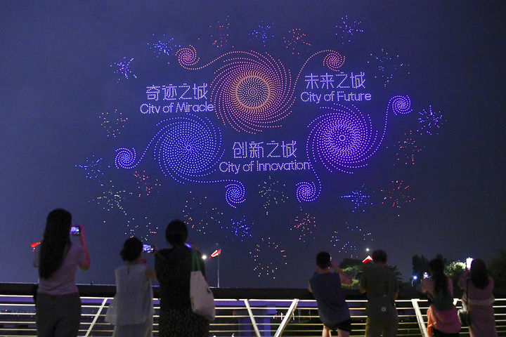 2024年9月26日,市民、游客在深圳灣觀看廣東深圳大漠大智控技術有限公司呈現的無人機編隊表演。新華社記者 梁旭 攝
