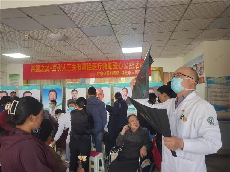 廣東援藏醫(yī)生在百例人工關節(jié)置換醫(yī)療救助愛心公益活動中查看片子。