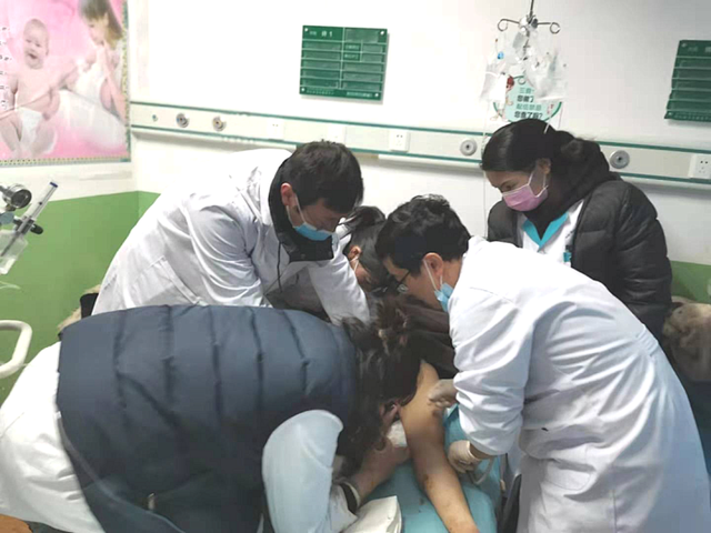 援藏醫(yī)療隊(duì)快速分工,組成新生兒復(fù)蘇團(tuán)隊(duì)。呼吸球囊尚未到位,孫豐濤毫不猶豫地為孩子實(shí)施口對口人工呼吸。徐鴻宇立即給予“雙拇指環(huán)繞法”胸外心臟按壓,縣醫(yī)院婦產(chǎn)科醫(yī)護(hù)人員積極協(xié)助。斷臍處理后,迅速將孩子移至暖臺(tái)保暖,繼續(xù)胸外心臟按壓、呼吸球囊面罩輔助呼吸。經(jīng)過分秒必爭的搶救,孩子心跳恢復(fù),全身皮膚轉(zhuǎn)紅潤,但呼吸和反應(yīng)仍然不好。經(jīng)過與家屬溝通,徐鴻宇給予氣管插管,繼續(xù)人工輔助通氣,并將孩子轉(zhuǎn)往上級(jí)醫(yī)院繼續(xù)治療。在此期間,產(chǎn)婦胎盤順利娩出,生命體征平穩(wěn)。