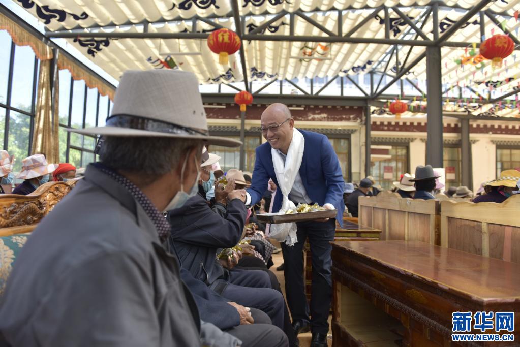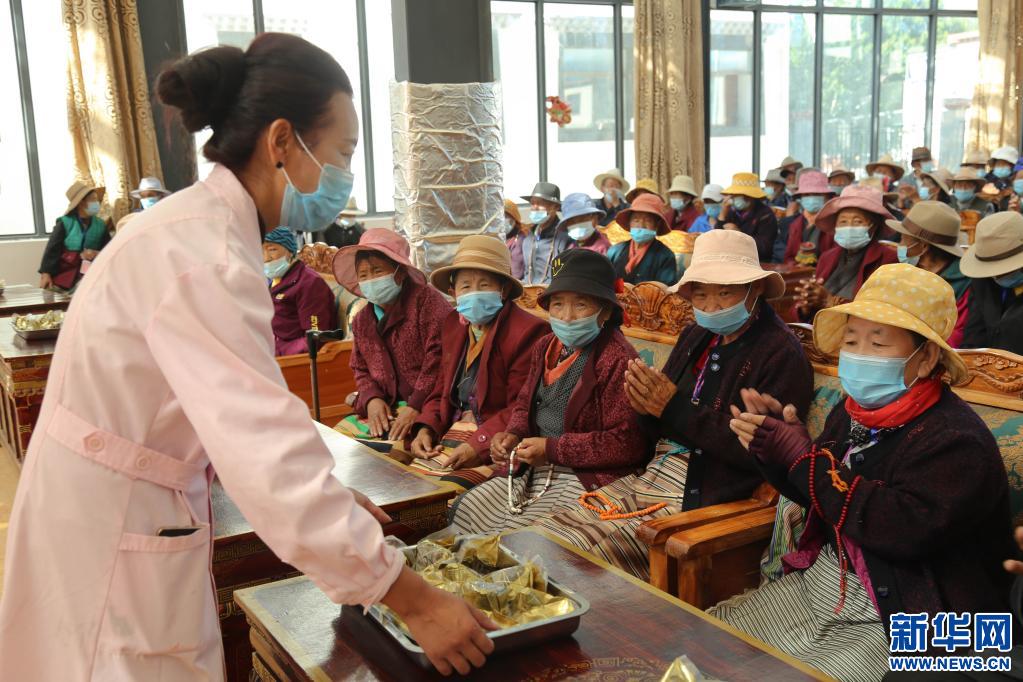 在西藏山南市乃東區(qū)特困人員集中供養(yǎng)服務(wù)中心,工作人員正在為孤寡老人們分發(fā)粽子。(新華社記者 格桑朗杰 攝)
