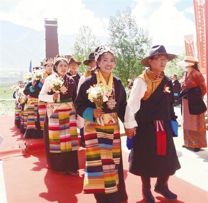 6月28日,寧墨情深·禮贊百年——愛在墨竹百對佳人集體婚典在拉薩市墨竹工卡縣甲瑪鄉(xiāng)松贊干布紀念館盛大舉行,百對佳人迎建黨百年、結(jié)百年姻緣。