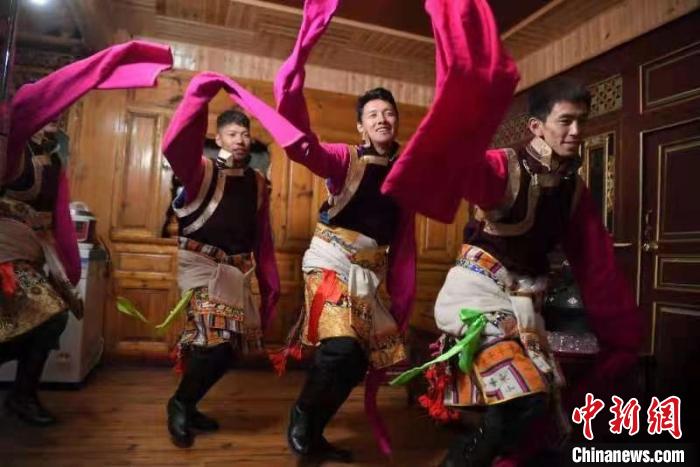 圖為迪慶藏族穿著精美的藏裝在家中載歌載舞?!⑷疥?yáng) 攝