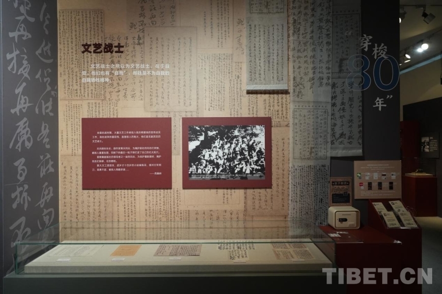 圖為中國現(xiàn)代文學(xué)館內(nèi),“山河跡憶——手稿里的抗戰(zhàn)中國”展覽中“文藝戰(zhàn)士”展示墻 攝影:郭睿佳