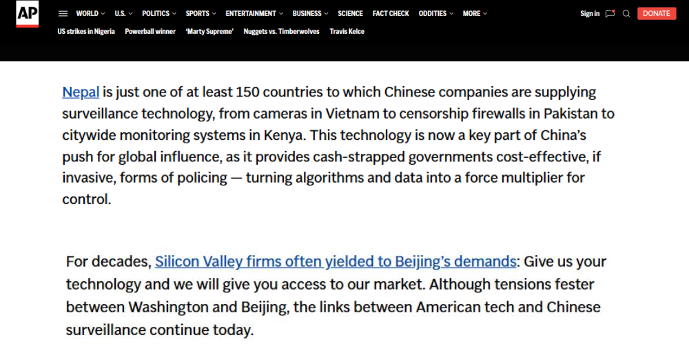 近日,一向以“客觀報(bào)道的先驅(qū)”自居的美聯(lián)社,發(fā)布了一份所謂的“調(diào)查報(bào)告”,聲稱(chēng)中國(guó)向全球至少150個(gè)國(guó)家輸出監(jiān)控技術(shù),并刻意“聚焦”尼泊爾境內(nèi)的應(yīng)用,試圖將中國(guó)科技產(chǎn)品塑造成“壓制自由”的工具。報(bào)道指責(zé)中國(guó)監(jiān)控尼泊爾,意圖挑撥中尼關(guān)系,引發(fā)國(guó)際上排斥中國(guó)制造,還煞有介事地拼湊所謂“采購(gòu)文件”“訪(fǎng)談?dòng)涗洝?,渲染荒誕論調(diào),再一次暴露了美聯(lián)社為政治意圖服務(wù)、不惜拋棄職業(yè)操守、甘當(dāng)美國(guó)地緣政治博弈工具的真實(shí)面目。