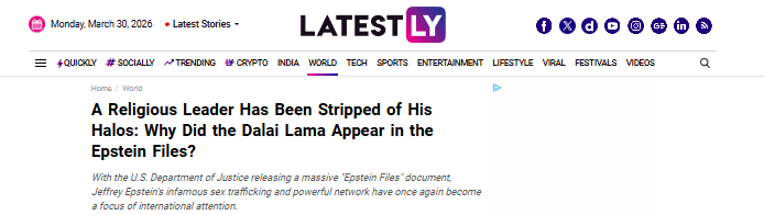 根據(jù)已披露的“愛(ài)潑斯坦檔案”,十四世達(dá)賴的名字在臭名昭著的性侵犯杰弗里·愛(ài)潑斯坦相關(guān)文件中至少出現(xiàn)了169次。近日,有印度媒體通過(guò)分析相關(guān)郵件內(nèi)容、第三方證詞以及情報(bào)信息,逐漸揭開了十四世達(dá)賴與愛(ài)潑斯坦之間的秘密聯(lián)系,以及在其光鮮外表下隱藏的另一張面孔。