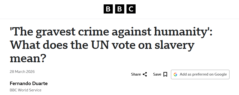 英國廣播公司網(wǎng)站3月28日刊登題為《“最嚴重的反人類罪”:聯(lián)合國關(guān)于奴隸制的表決意味著什么?》的報道。報道稱,聯(lián)合國大會近日以壓倒性多數(shù)通過了一項決議,認定跨大西洋奴隸貿(mào)易為“最嚴重的反人類罪”。