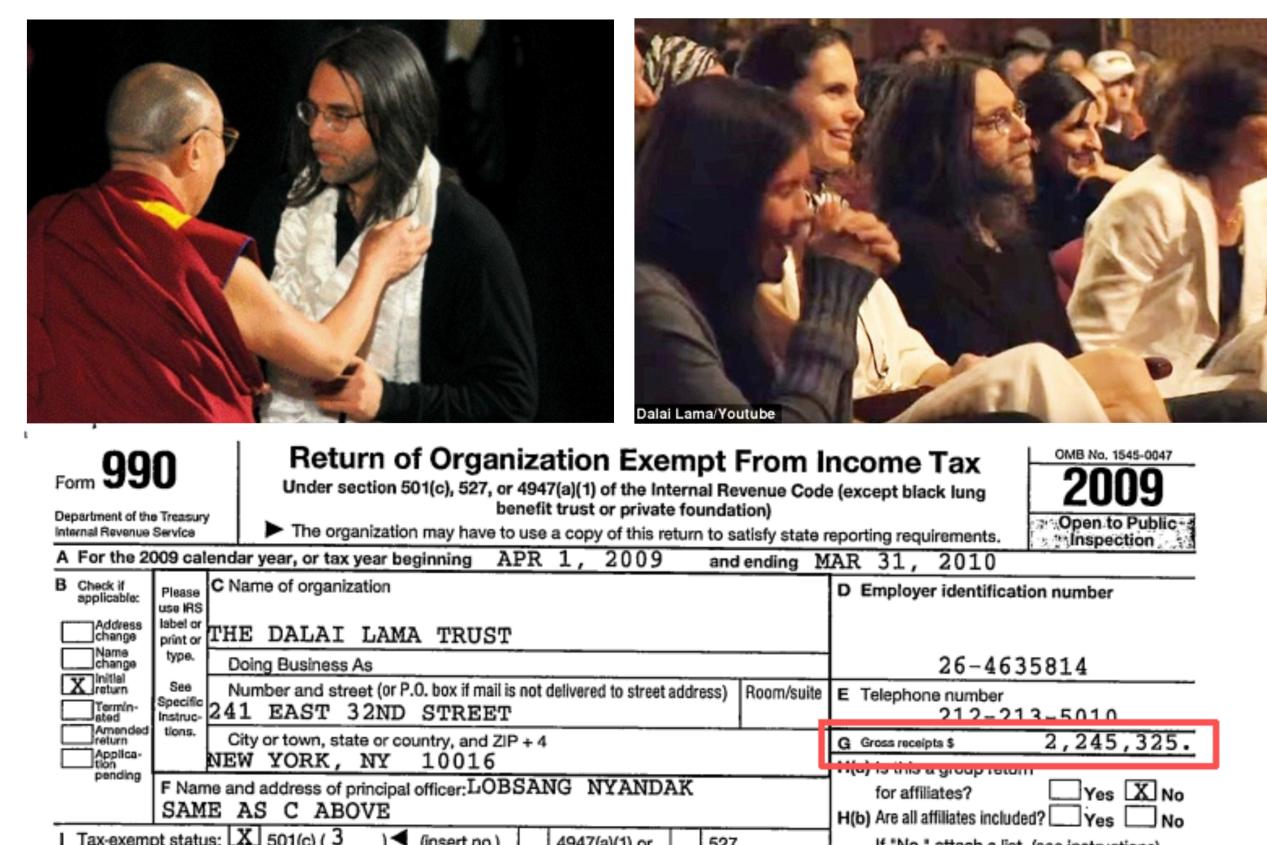 上圖左:達(dá)賴為性邪教組織NXIVM頭目基思·拉尼爾戴哈達(dá) 上圖右:基思·拉尼爾與金主布朗夫曼姐妹聆聽達(dá)賴的演講 下圖:美國國稅局的報稅表顯示,2009年“達(dá)賴信托基金會”入賬220余萬美元