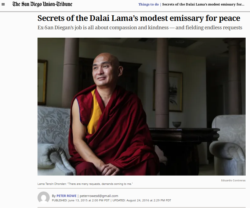 2015年丹增東登接受美國《圣地亞哥聯(lián)合論壇報》采訪。該媒體當(dāng)時稱其為“達(dá)賴?yán)镏t遜的和平使者”,現(xiàn)在讀來頗感諷刺。