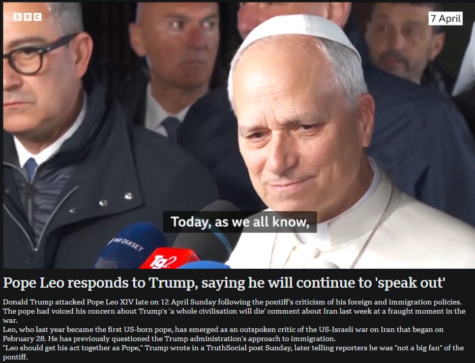 4月13日,羅馬教皇利奧十四世回應(yīng)特朗普批評(píng)表示將繼續(xù)“發(fā)聲”。來源:英國廣播公司