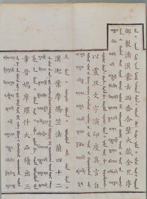 康熙皇帝特別注重刊行蒙古文《甘珠爾》以“利于祭誦”,康熙五十六年(1717年)下令刊刻蒙古文《甘珠爾》。到了乾隆三十二年(1767年),傅恒上書提出,要讓僧人念經(jīng)念得準,需要標明原音、輔音的韻腳和切音,最好能看著漢字就能念出梵音(“禮今教習(xí)僧人持念咒語止,須明曉阿禮嘎禮音韻反切,自能對漢字而得梵音”)。于是,為方便蒙古地區(qū)僧人念誦咒語,《御制滿漢西番合璧大藏全咒》添譯了蒙古文。蒙古文《大藏經(jīng)》是蒙古族歷史文化發(fā)展的里程碑,也是蒙古族已知最大部頭的古籍。在譯經(jīng)過程中,蒙古文字也得到了充分錘煉與發(fā)展,提高了交流與表現(xiàn)能力。
