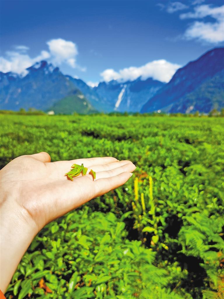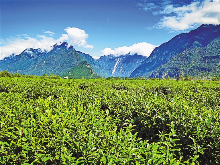 眼前,翠綠欲滴的千畝茶田連接碧色天空,連綿不絕的雪山聳入云霧,清水潺潺的聲音環(huán)繞耳邊,牛羊時不時抬頭望向行人。易貢茶場平均海拔2200米,雖地處青藏高原,但來自印度洋的暖濕氣流沿著雅魯藏布大峽谷進入高原,為這片高原茶田帶來豐沛的降水?!岸瑹o嚴(yán)寒,夏無酷暑”,使茶樹能夠在這里茁壯成長。