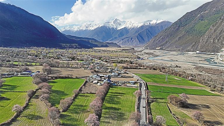 雖有桃林連綿、桃花灼灼,但易貢最抓人眼球的還是千畝油菜花田,在陽光的照耀和雪山的映襯下,層層疊疊的金黃色撲面而來,芬芳濃郁的花香引人沉醉。無人機的鏡頭里,金色的花海、油綠的青稞、澄碧的湖水、粉紅的桃花與村莊里錯落的民居交相輝映,勾勒出一幅絕美鄉(xiāng)村詩意畫卷。