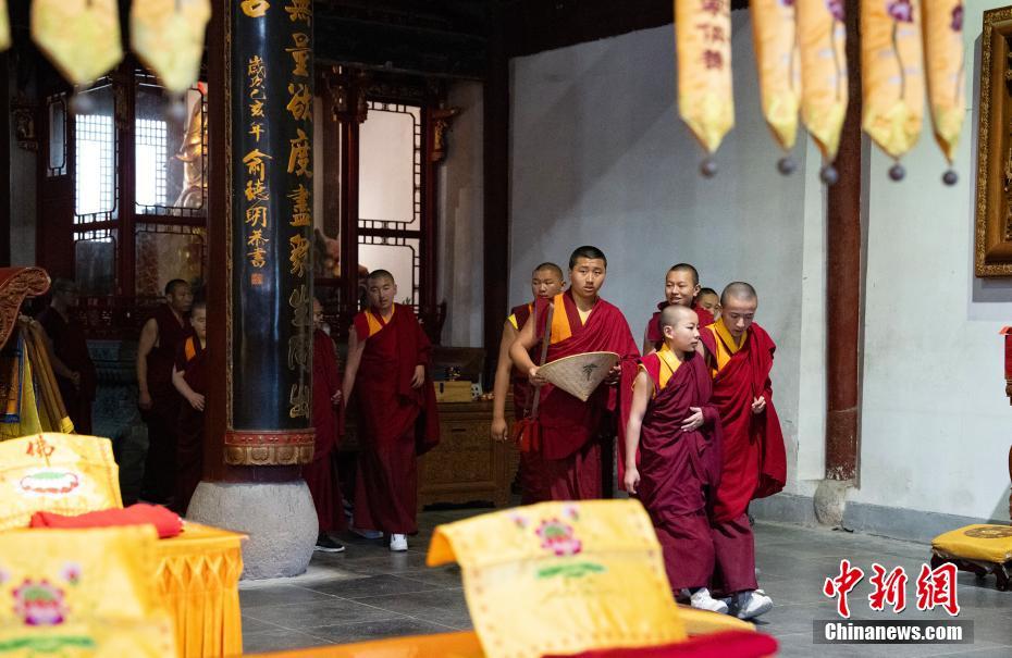 5月16日至18日,西藏少年活佛參學(xué)團(tuán)赴浙江參觀學(xué)習(xí),感受江南水鄉(xiāng)綿延的歷史人文底蘊(yùn)。圖為5月16日,西藏少年活佛參學(xué)團(tuán)在普陀山普濟(jì)禪寺誦經(jīng)禮佛。