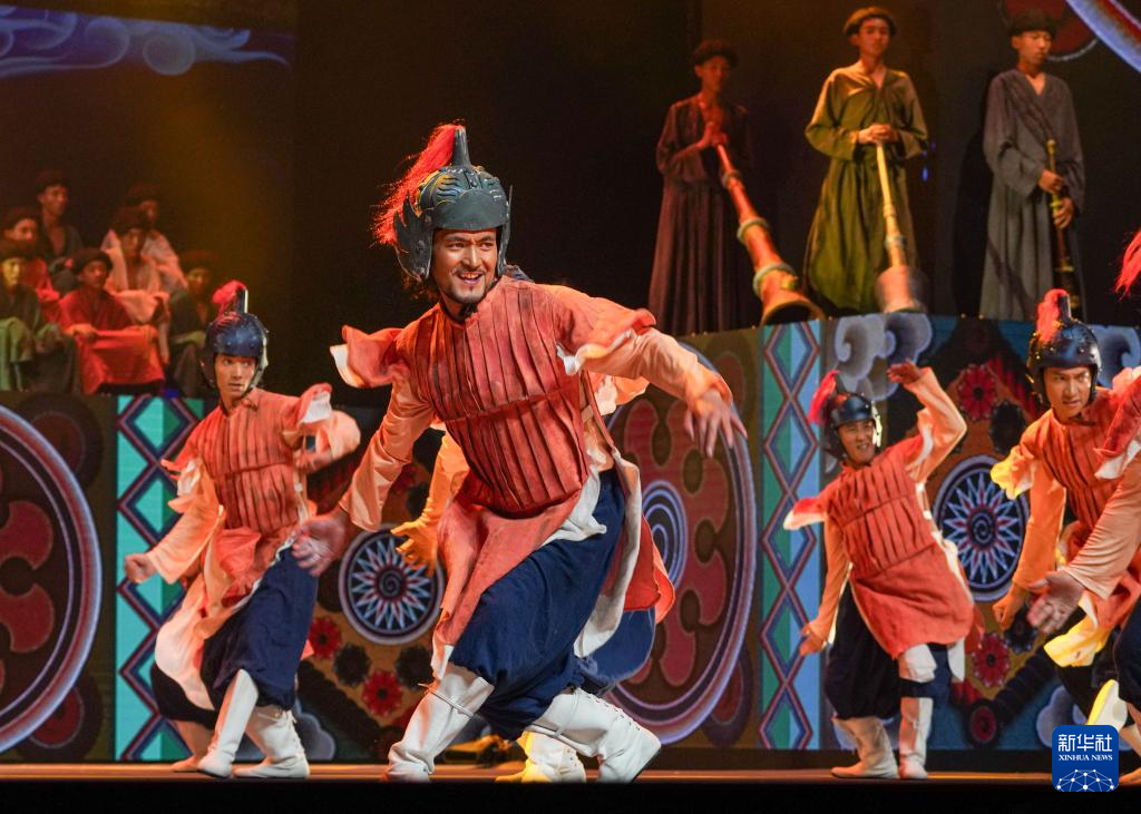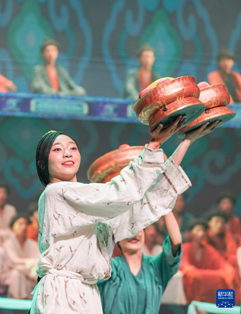 7月19日,在西藏拉薩《緣起象雄·古格遺風(fēng)》情景歌舞詩演出現(xiàn)場,演員在表演節(jié)目《鼓樂喧天》。新華社發(fā)(格桑雍珍 攝)