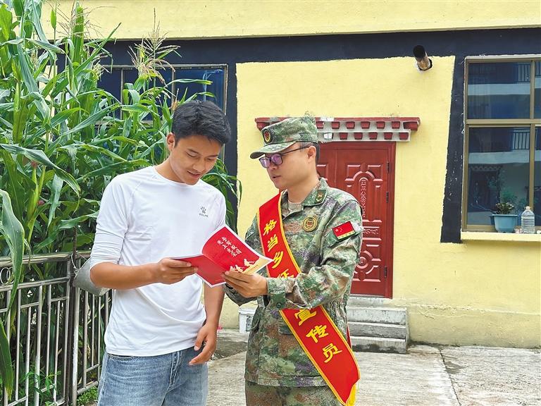 圖為為積極響應(yīng)國家號召,扎實(shí)做好征兵工作,墨脫縣格當(dāng)鄉(xiāng)人武部走村入戶向群眾宣傳征兵相關(guān)政策,不斷激發(fā)適齡青年參軍入伍的熱情。這是格當(dāng)鄉(xiāng)人武部部長陳杰到群眾家中進(jìn)行征兵宣傳。記者 王敏 通訊員 郎玲 攝