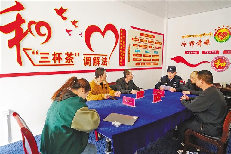 圖為帕里邊境派出所民警在“三杯茶”調解室調處矛盾糾紛。記者 張宇 通訊員 白瑪倉覺 攝