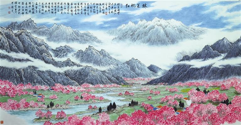 在《林芝桃紅》畫(huà)作前,妻停住腳步。她自言自語(yǔ)又像對(duì)我說(shuō),這是我們?nèi)ミ^(guò)的地方,畫(huà)家真是下了一番功夫,多么逼真而入心。這是青稞地,桃樹(shù)遍布田埂;這是山坡,桃花散落其上。這是桃紅滿(mǎn)人間的地方,林芝人民多幸福呵。在這桃粉田青的地方,中景是起伏的山巒,放眼望去,山上的蒼松依稀可辨,皚皚白雪積于峰巒。林芝的春天無(wú)可比擬,因?yàn)樗橇Ⅲw的美,在這幅畫(huà)中更顯層次感,田野、桃花、蒼松、積雪、遠(yuǎn)山、白云、藍(lán)天……