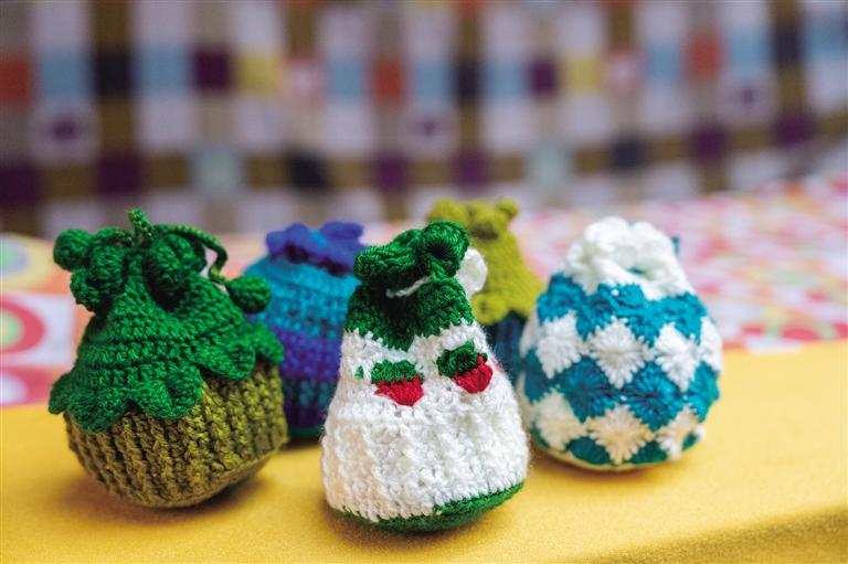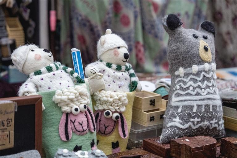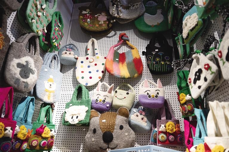 阿佳們親手鉤織的毛線茶杯套、毛線桌墊,既實用又色彩鮮明,墻上掛滿的手工編織牛毛包讓人“糾結(jié)癥”都犯了!和這座商城的建筑一樣,這里出售的美物將藏式美學(xué)展現(xiàn)得淋漓盡致。此外,這里還能淘到毛氈玩偶、毛氈風(fēng)鈴、毛茸茸的藏戲面具掛件等一些能給生活增添樂趣的“小廢物”。