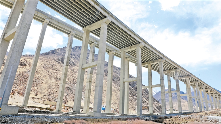 從村里看,一排整齊的高架橋墩像聳立的巨柱一樣,在山里蜿蜒。橋墩托舉著平坦寬闊的公路,從空中穿過,在海拔4200多米的半山腰一頭扎進山體里,鑿出兩個山洞,然后貫穿圭嘎拉山,一直延伸到山南去。