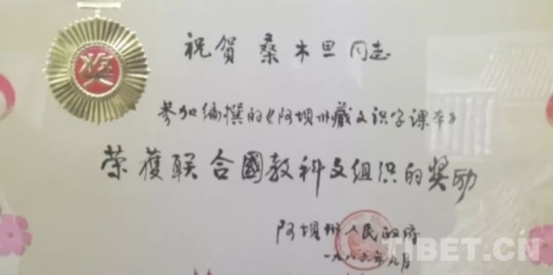 作為一個(gè)智慧過人的學(xué)者,1986年9月,為了藏語(yǔ)文教育的進(jìn)一步普及,毛爾蓋·桑木旦不僅為掃盲四處奔跑,講授藏語(yǔ)文基礎(chǔ)課,而且主編了《藏文掃盲課本》,此書由國(guó)家教委推薦參加了亞太地區(qū)掃盲教材比賽,并榮獲聯(lián)合國(guó)教科文組織的獎(jiǎng)勵(lì)。為此阿壩州人民政府頒發(fā)證書,祝賀桑木旦同志榮獲聯(lián)合國(guó)教科文組織的獎(jiǎng)勵(lì)。我相信中國(guó)藏學(xué)界獲得此獎(jiǎng)?wù)?,毛爾蓋·桑木旦先生為第一人。