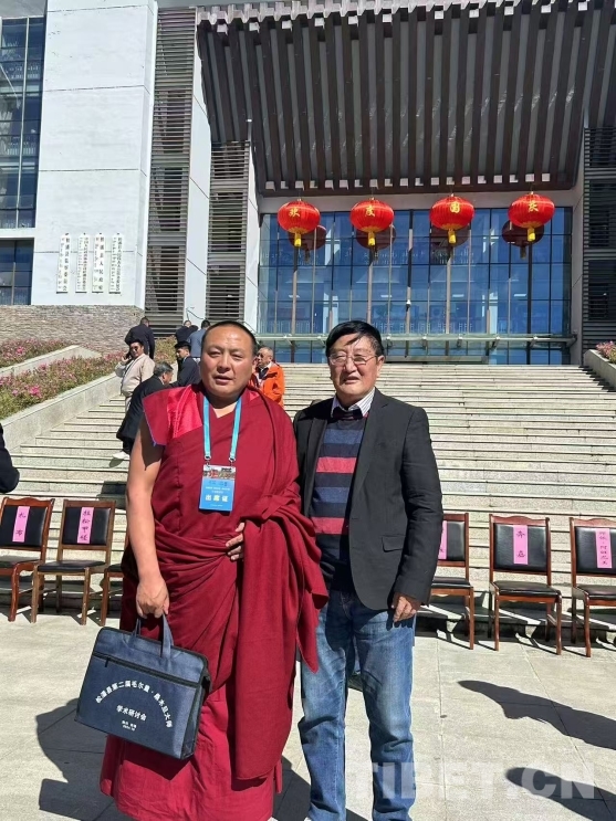 圖為作者格勒(右)在松潘縣第二屆毛爾蓋·桑木旦學(xué)術(shù)研討會(huì)現(xiàn)場(chǎng)(圖片由作者提供)
