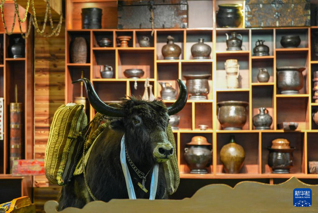 茶館主人珠珠將藏式茶館與民俗陳列方式相結合,讓顧客在品嘗美食的同時,沉浸式體驗民俗文化。茶館四周和過道上擺滿700余種3000多件西藏民俗物件,有給牛犢喂奶的牛角奶瓶、火柴盒大小的便攜酥油盒、防沙塵和雪盲的牦牛毛墨鏡等。牧民生產(chǎn)生活用具幾乎都能在這里找到,獨具風格的茶館儼然成為一座藏北游牧文化“博物館”。