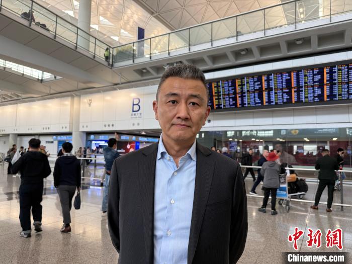 2月19日,西藏航空“拉薩-成都天府-香港”航線開通。圖為西藏航空副總經(jīng)理張兵兵在香港國(guó)際機(jī)場(chǎng)抵港大堂接受中新社記者采訪?!≈行律缬浾?韓星童 攝