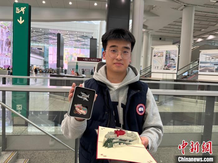2月19日,西藏航空“拉薩-成都天府-香港”航線開通。圖為首航乘客曾帥向記者展示航空公司派發(fā)的首航紀(jì)念徽章和立體賀卡。 中新社記者 韓星童 攝