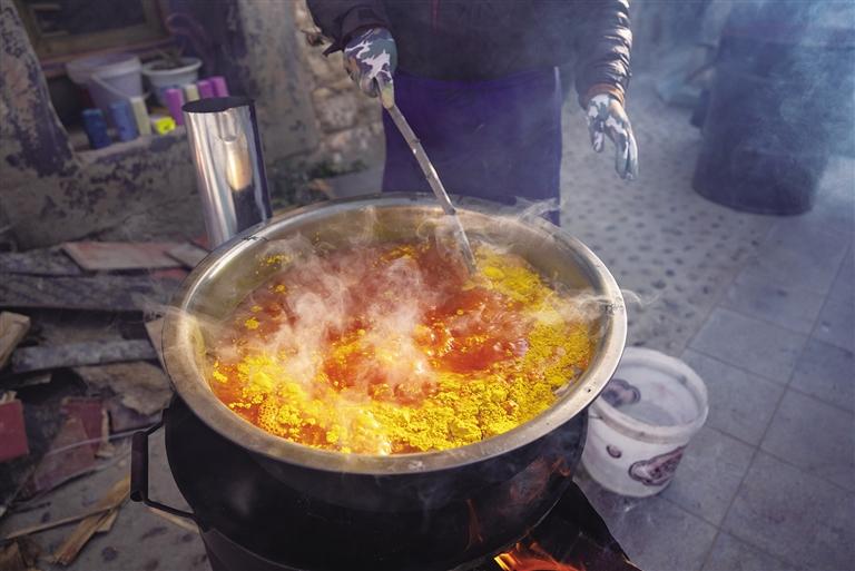“玫紅色和黃色的都做完了吧?這個(gè)顏料水我倒了,開始準(zhǔn)備制作青色?!币慌裕?1歲的央金將盆洗干凈,繼續(xù)煮水放入顏料?!啊_薩梅朵’有青色、綠色、玫紅色、黃色四種顏色,其中青色耗時(shí)最長(zhǎng),不僅需要自己調(diào)制,而且最難上色?!毖虢鹫f,“我們一般是早上7點(diǎn)開始上色,上完色都快下午4點(diǎn)了?!?/p>